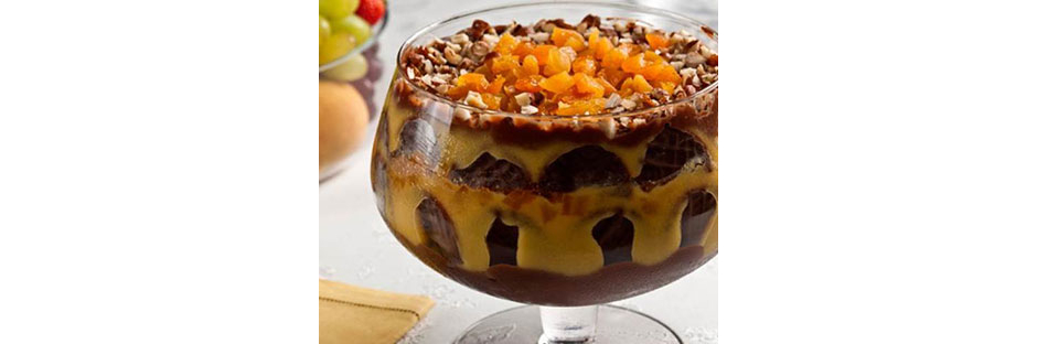 • No refratário que irá servir o pavê, alterne camadas de biscoitos umedecidos com champanhe e suco de laranja, o creme de chocolate com avelã e camadas do creme de damasco com os damascos picados;